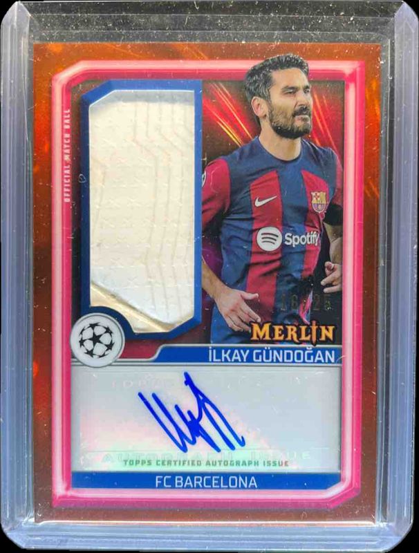 The Ilkay Gundogan 2023 Topps Merlin Chrome UEFA Club Competitions #MBS-IG Match Ball Signatures - Orange Refractor /25 card is 1 of 6 Ilkay Gundogan's card variations in the 2023 Topps Merlin Chrome UEFA Club Competitions set being tracked by Sports Card Investor, including Match Ball Signatures, Match Ball Signatures - Gold Refractor /50, Match Ball Signatures - Black Refractor /10, Match Ball Signatures - Red Refractor /5, and Match Ball Signatures - Superfractor /1.