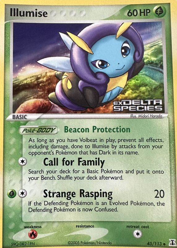 The Illumise 2005 EX: Delta Species #045/113 Reverse Holo card in Raw TCG (Near Mint) condition has moved up $2.26 (+228%) in the last 30 days and was last sold for $3.25 .