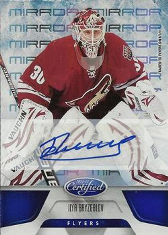 The Ilya Bryzgalov 2011 Certified #106 Mirror Blue Signatures /99 card is 1 of 39 Ilya Bryzgalov's card variations in the 2011 Certified set being tracked by Sports Card Investor, including Base /499, Totally Silver, Mirror Red /199, Mirror Red Materials Dual /150, and Mirror Blue /99.