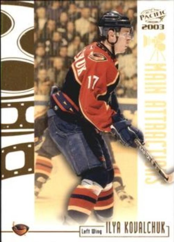 The Ilya Kovalchuk 2002 Pacific #2 Main Attractions card is 1 of 14 Ilya Kovalchuk's card variations in the 2002 Pacific set being tracked by Sports Card Investor, including Base /999, Red, Blue /45, Nights SE /10, and Impact Zone.