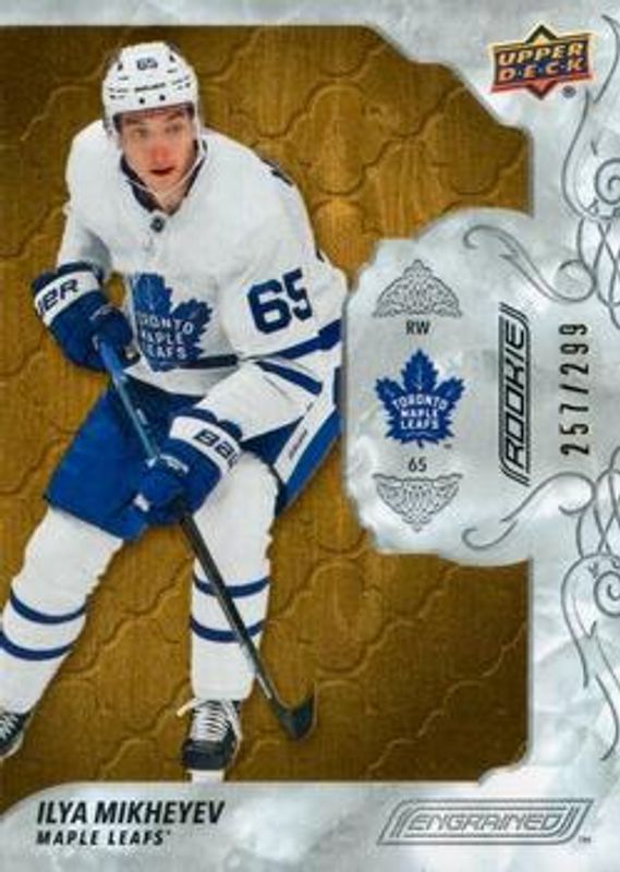 The Ilya Mikheyev 2019 Upper Deck Engrained #87 Base /299 Rookie card is 1 of 11 Ilya Mikheyev's card variations in the 2019 Upper Deck Engrained set being tracked by Sports Card Investor, including Ebony /49, Mahogany /10, Rosewood /1, Oak Auto, and Rookie Signatures Shots /249.