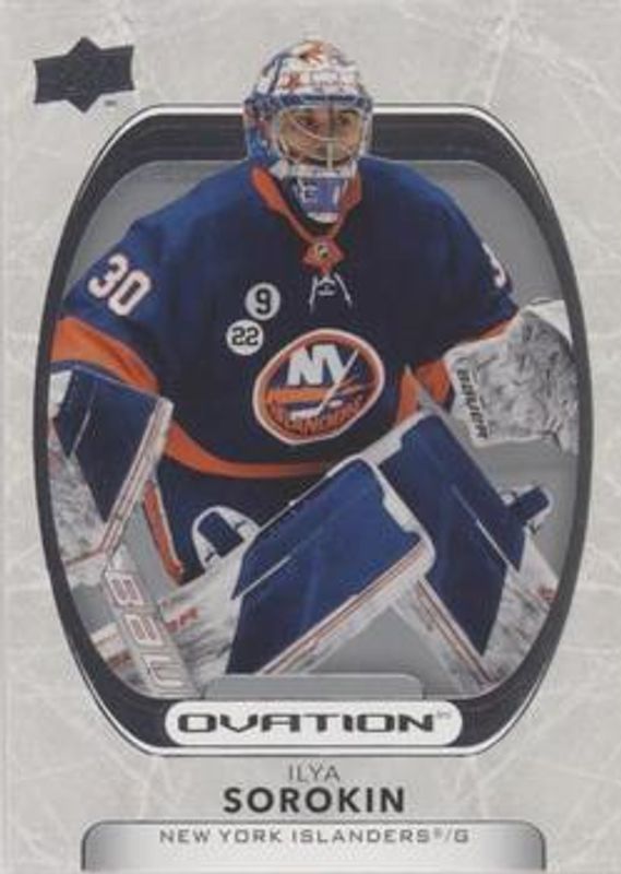 The Ilya Sorokin 2021 Upper Deck Ovation #92 Base card is 1 of 13 Ilya Sorokin's card variations in the 2021 Upper Deck Ovation set being tracked by Sports Card Investor, including Checkerboard, Gold Circular Wonder, Gold Foil, Silver Foil, and Standing Ovation /500.