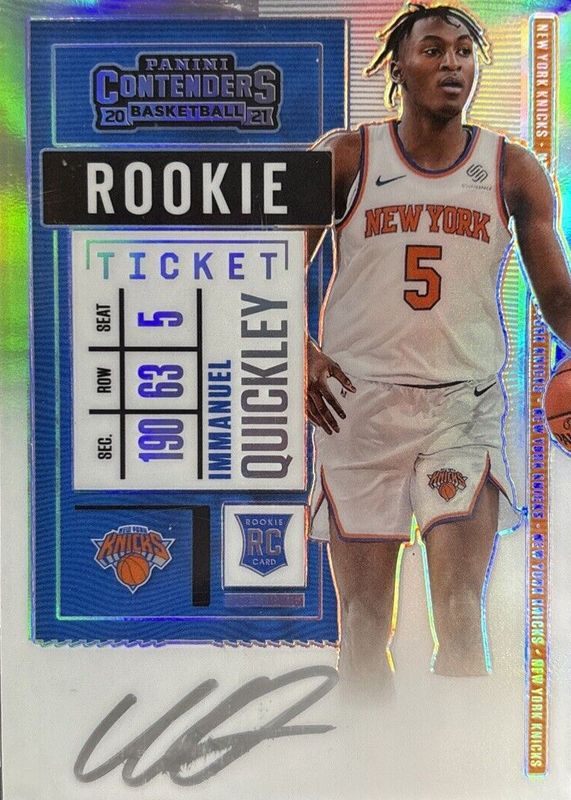 This card is 1 of 28 Immanuel Quickley's card variations in the 2020 Contenders set being tracked by Sports Card Investor, including Rookie Ticket Auto (White Jersey), Rookie Ticket Auto - Clear Ticket (White Jersey), Rookie Ticket Auto - Premium Green Shimmer (White Jersey), Rookie Ticket Auto - Ticket Stub (/5 - White Jersey), and Rookie Ticket Auto Variation (Blue Jersey).