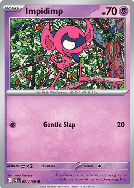 The Impidimp 2025 Scarlet & Violet: Journey Together #071/159 Base card in Raw TCG (Near Mint) condition has not changed in price in the last 30 days and was last sold for $1.34 .