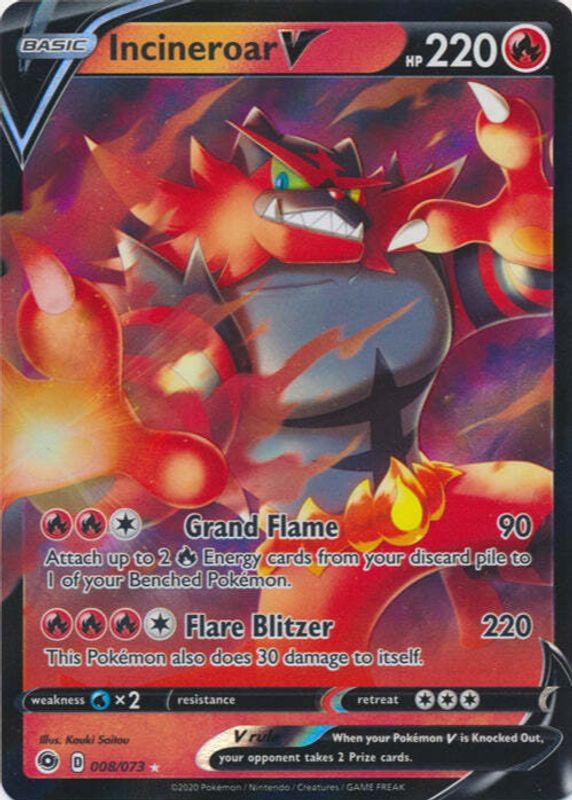 The Incineroar V 2020 Champion's Path #08/73 Holo card in Raw TCG (Near Mint) condition has moved down -$0.42 (-28.2%) in the last 30 days and was last sold for $1.07 .