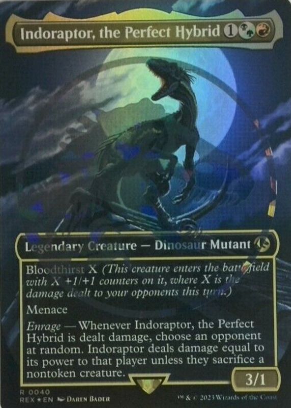 The Indoraptor, the Perfect Hybrid 2023 Universes Beyond: Jurassic World Collection #0040 Embossed card in PSA 10 condition has not changed in price in the last 30 days and was last sold for $400.00 .