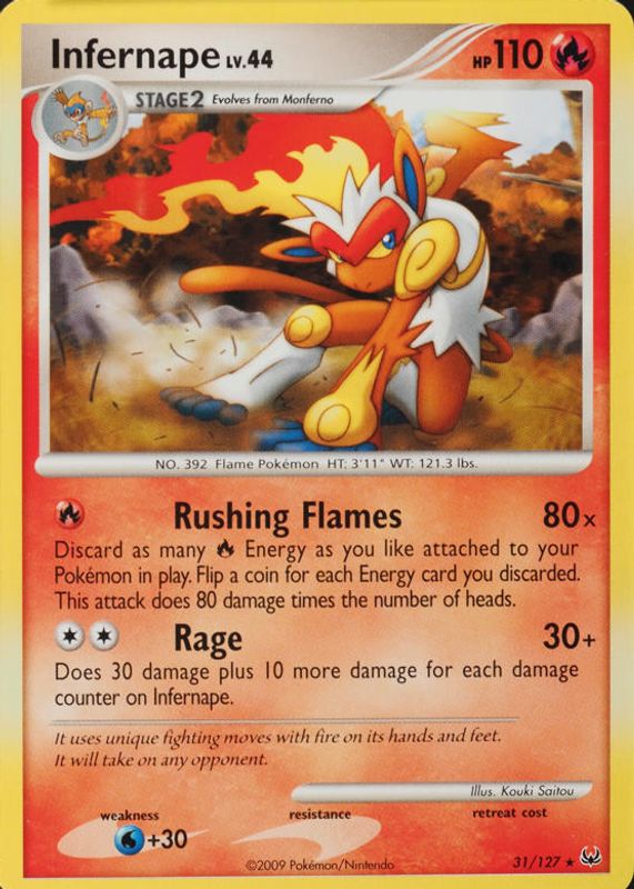 The Infernape 2009 Platinum #031/127 Base card in Raw TCG (Lightly Played) condition has moved down -$1.49 (-37.3%) in the last 30 days and was last sold for $2.50 .