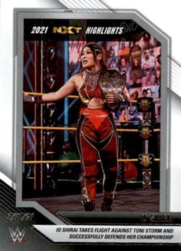 The Io Shirai 2022 Panini WWE NXT #7 2021 NXT Highlights card is 1 of 51 Io Shirai's card variations in the 2022 Panini WWE NXT set being tracked by Sports Card Investor, including Base, Green, Silver, Red /199, and Blue /149.