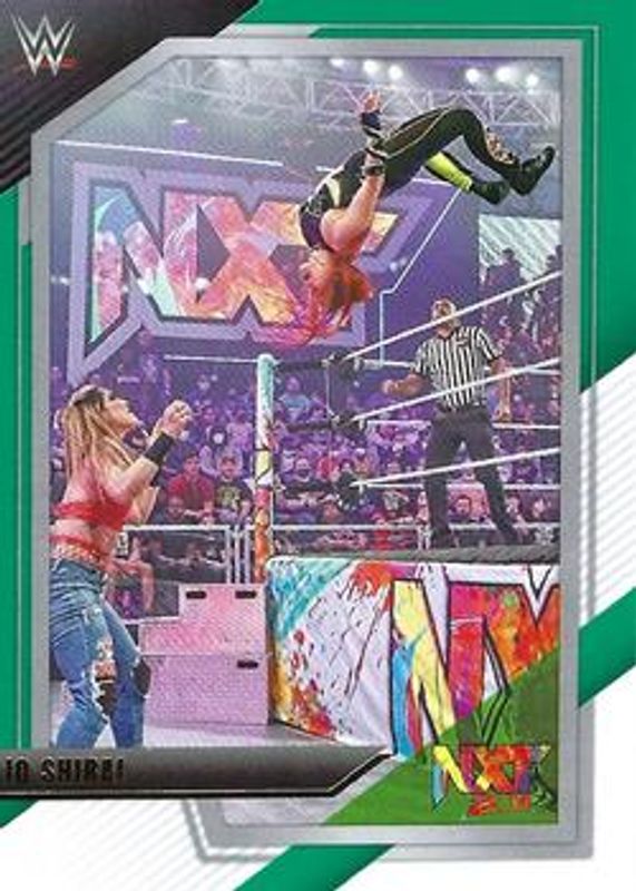The Io Shirai 2022 Panini WWE NXT #63 Green card is 1 of 51 Io Shirai's card variations in the 2022 Panini WWE NXT set being tracked by Sports Card Investor, including Base, Silver, Red /199, Blue /149, and Purple /99.