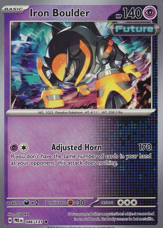 The Iron Boulder 2025 Scarlet & Violet: Prismatic Evolutions #046/131 Master Ball Reverse Holo card in Raw TCG (Lightly Played) condition has not changed in price in the last 30 days and was last sold for $3.87 .