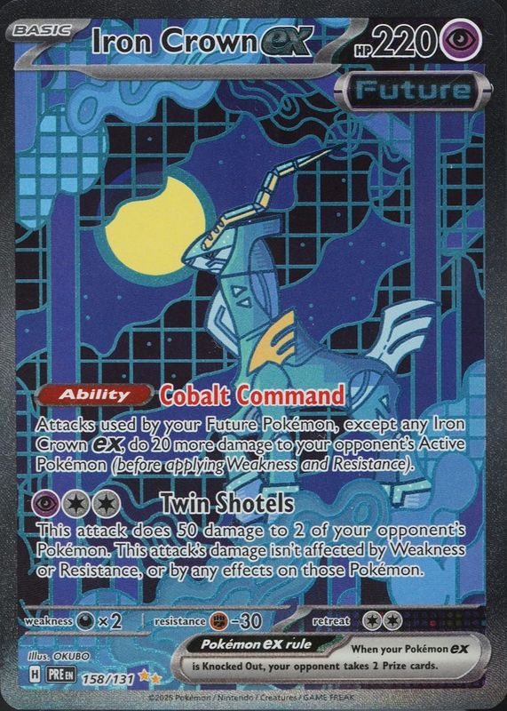 The Iron Crown ex 2025 Scarlet & Violet: Prismatic Evolutions #158/131 Special Illustration Rare card in Raw TCG (Lightly Played) condition has not changed in price in the last 30 days and was last sold for $36.00 .