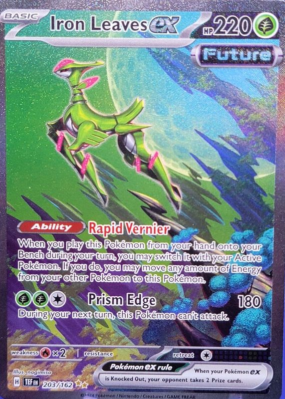 The Iron Leaves ex 2024 Scarlet & Violet: Temporal Forces #203/162 Special Illustration Rare card in Raw TCG (Near Mint) condition has moved up $3.14 (+14.0%) in the last 30 days and was last sold for $25.64 .