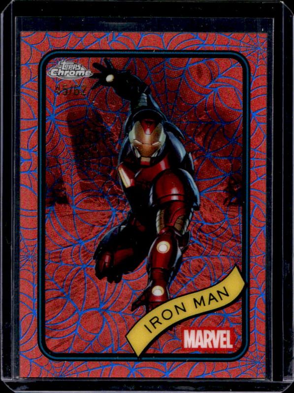 The Iron Man 2025 Topps Chrome #1 Blue & Red Spider Web Refractor /62 card is 1 of 111 Iron Man's card variations in the 2025 Topps Chrome set being tracked by Sports Card Investor, including Base, Refractor, Yellow Lava Refractor, Spider Web Refractor /399, and Blue Refractor /299.