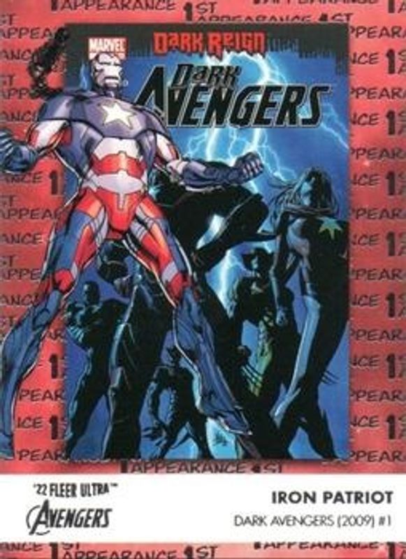 The Iron Patriot 2022 Fleer Ultra Avengers #FA-15 1st Appearances card is 1 of 13 Iron Patriot's card variations in the 2022 Fleer Ultra Avengers set being tracked by Sports Card Investor, including 1st Appearances - Green Foil, Checkmate, 1st Appearances - Orange Foil /549, 1st Appearances - Blue Foil /360, and 1st Appearances - Burgundy Foil /141.
