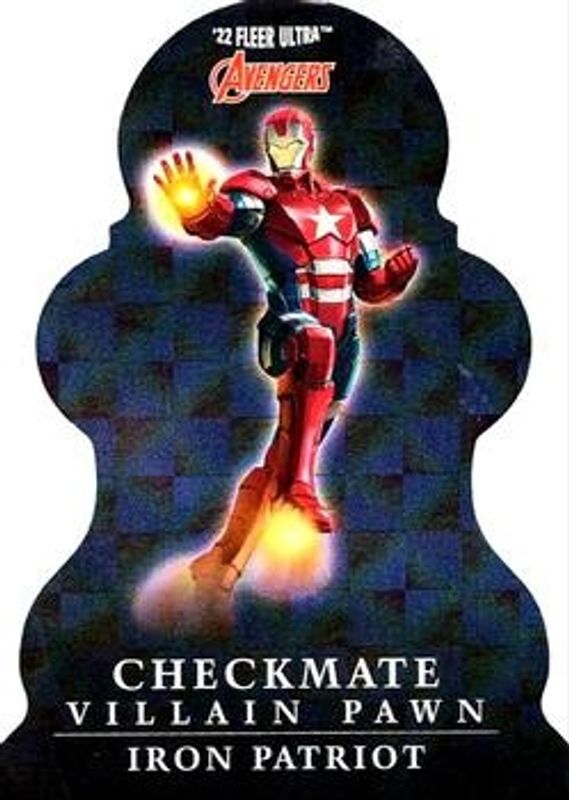 The Iron Patriot 2022 Fleer Ultra Avengers #CP-22 Checkmate card is 1 of 13 Iron Patriot's card variations in the 2022 Fleer Ultra Avengers set being tracked by Sports Card Investor, including 1st Appearances, 1st Appearances - Green Foil, 1st Appearances - Orange Foil /549, 1st Appearances - Blue Foil /360, and 1st Appearances - Burgundy Foil /141.
