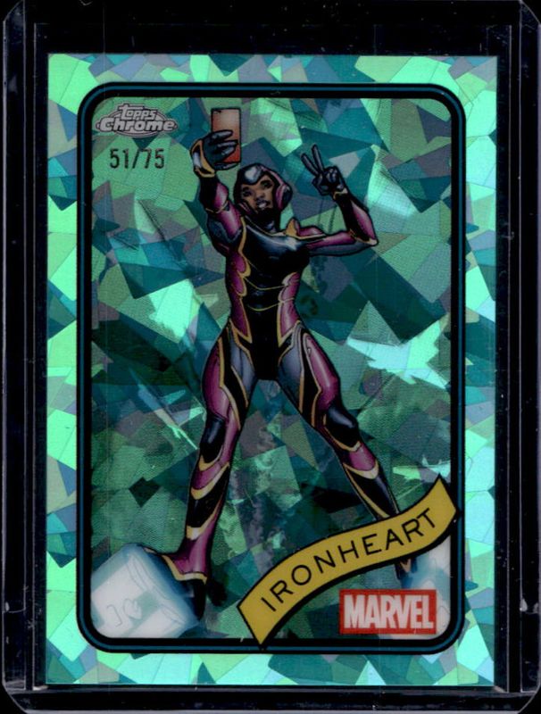 The Ironheart 2025 Topps Chrome Sapphire Edition #71 Aqua Refractor /75 card is 1 of 9 Ironheart's card variations in the 2025 Topps Chrome Sapphire Edition set being tracked by Sports Card Investor, including Base, Green Refractor /99, Gold Refractor /50, Orange Refractor /25, and Purple Refractor /15.
