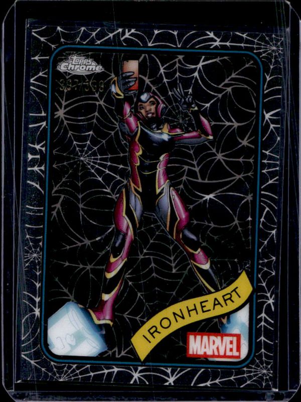 The Ironheart 2025 Topps Chrome #71 Spider Web Refractor /399 card is 1 of 23 Ironheart's card variations in the 2025 Topps Chrome set being tracked by Sports Card Investor, including Base, Refractor, Yellow Lava Refractor, Blue Refractor /299, and Blue & Green Shimmer Refractor /199.