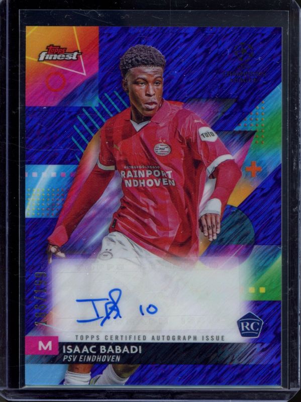 The Isaac Babadi 2023 Topps Finest UEFA Club Competitions #A-IB Autographs - Purple Shimmer /199 Rookie card is 1 of 51 Isaac Babadi's card variations in the 2023 Topps Finest UEFA Club Competitions set being tracked by Sports Card Investor, including Base, Refractor, Purple /299, Sky Blue /275, and Blue Aqua Vapor Wave /250.