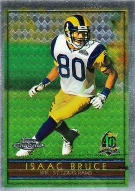 The Isaac Bruce 1996 Topps Chrome #60 Base card is 1 of 7 Isaac Bruce's card variations in the 1996 Topps Chrome set being tracked by Sports Card Investor, including #92 Base, #92 1,000 Yard Club - Refractor, #92 Refractor, #60 Refractor, and #30 40th Anniversary Retros.