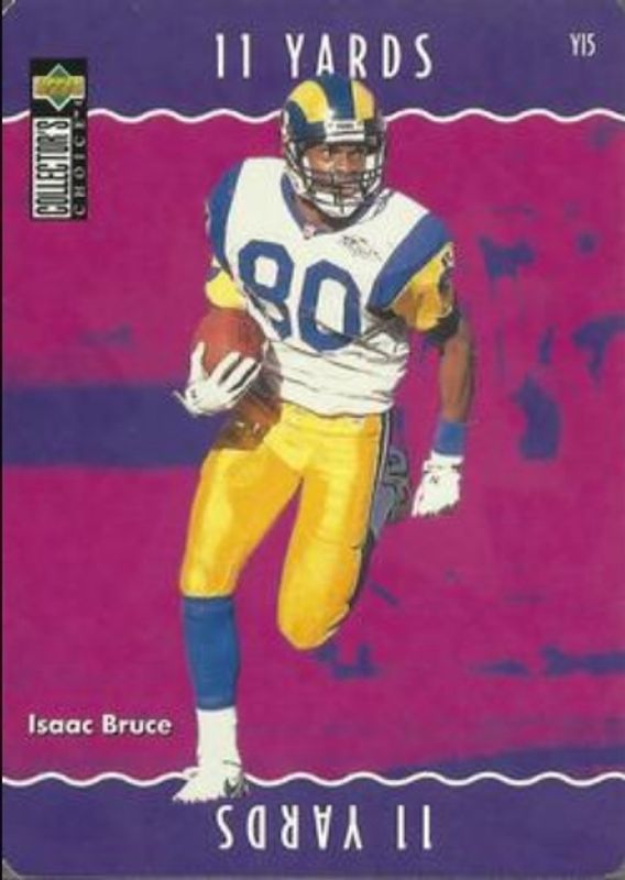 The Isaac Bruce 1996 Upper Deck Collector's Choice Update #Y15 You Make The Play card is 1 of 5 Isaac Bruce's card variations in the 1996 Upper Deck Collector's Choice Update set being tracked by Sports Card Investor, including Base, Play Action Stick Ums, Play Action Stick Ums Mystery Bases, and You Make The Play.