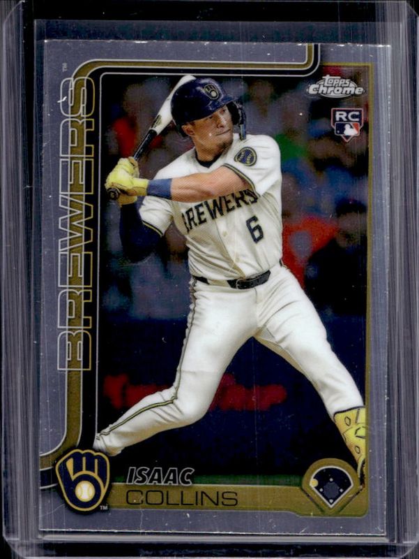 The Isaac Collins 2025 Topps Chrome #92 Base Rookie card is 1 of 73 Isaac Collins' card variations in the 2025 Topps Chrome set being tracked by Sports Card Investor, including Geometric Refractor, Lightboard Logo Variation, Negative Refractor, Prism Refractor, and RayWave Refractor.
