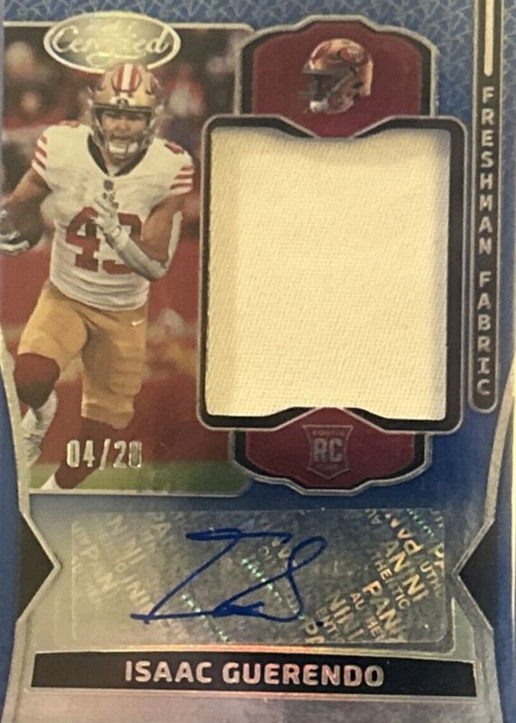 The Isaac Guerendo 2024 Certified #FMS-IGO Freshman Fabric Signatures - Mirror Blue Etch /20 Rookie card in Raw condition has not changed in price in the last 30 days and was last sold for $38.00 .