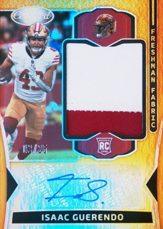 Isaac Guerendo 2024 Certified #FMS-IGO Freshman Fabric Signatures - Mirror Gold /25 Rookie RAW Price Guide