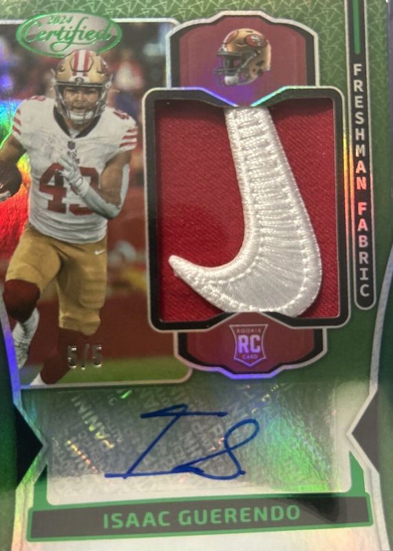 The Isaac Guerendo 2024 Certified #FMS-IGO Freshman Fabric Signatures - Mirror Green /5 Rookie card in Raw condition has not changed in price in the last 30 days and was last sold for $175.00 .