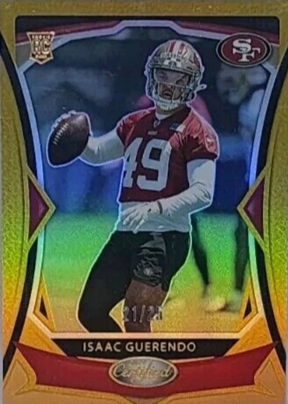 This card is 1 of 37 Isaac Guerendo's card variations in the 2024 Certified set being tracked by Sports Card Investor, including Base Rookie /400, Mirror /350, Mirror Bronze /275, Mirror Pink /225, and Mirror Orange /150.