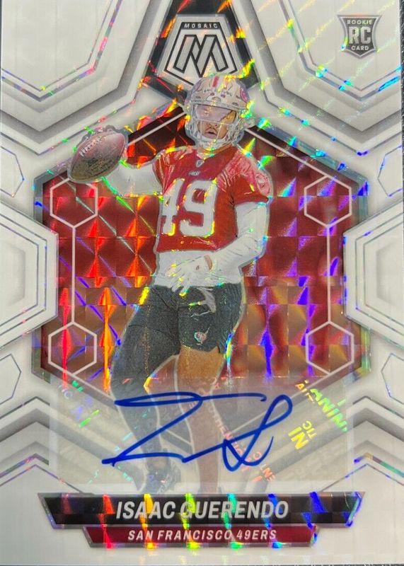 This card is 1 of 13 Isaac Guerendo's card variations in the 2024 Mosaic set being tracked by Sports Card Investor, including Rookie Autographs - Choice Fusion Red & Yellow, Rookie Autographs - No Huddle Blue, Rookie Autographs - Red /199, Rookie Autographs - Blue /99, and Rookie Autographs - Purple /49.