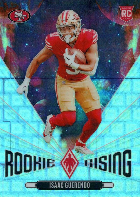 This card is 1 of 18 Isaac Guerendo's card variations in the 2024 Phoenix set being tracked by Sports Card Investor, including Rookie Rising, Rookie Rising - Hyper, Rookie Rising - Lazer, Rookie Rising - Orange, and Rookie Rising - Purple.
