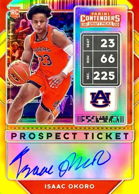 The Isaac Okoro 2020 Contenders Optic #102 Rookie Ticket Auto - Gold /10 (White Jersey) card in Raw condition has not changed in price in the last 30 days and was last sold for $21.50 .