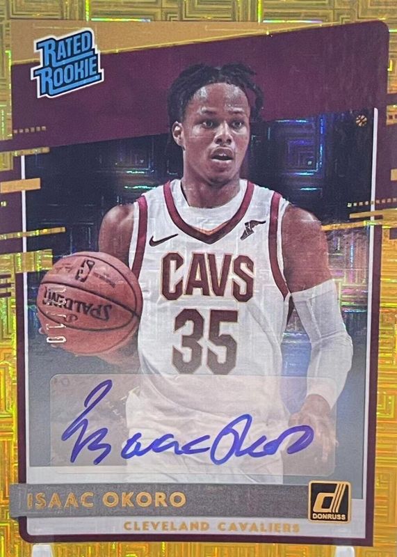 The Isaac Okoro 2020 Donruss #203 Rated Rookie Signatures - Choice Gold /10 card in Raw condition has not changed in price in the last 30 days and was last sold for $23.73 .