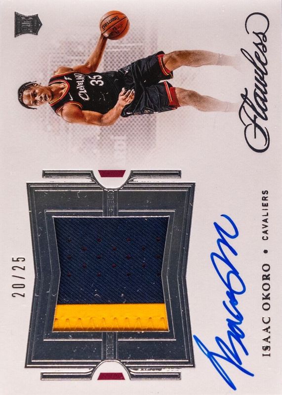 The Isaac Okoro 2020 Flawless #FPA-OKO Flawless Patch Autographs /25 Rookie card in Raw condition has not changed in price in the last 30 days and was last sold for $69.00 .
