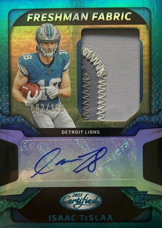 Isaac TeSlaa 2025 Certified #FBC-ITA Freshman Fabric Signatures - Mirror Teal /199 Rookie RAW Price Guide