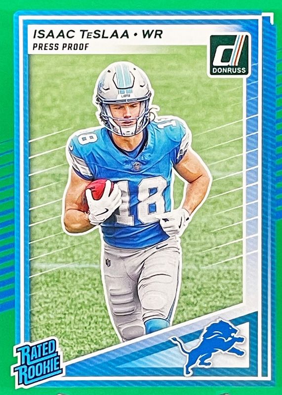 2025 Panini Donruss Isaac Teslaa Rated Rookie Green Press Proof #338 Lions