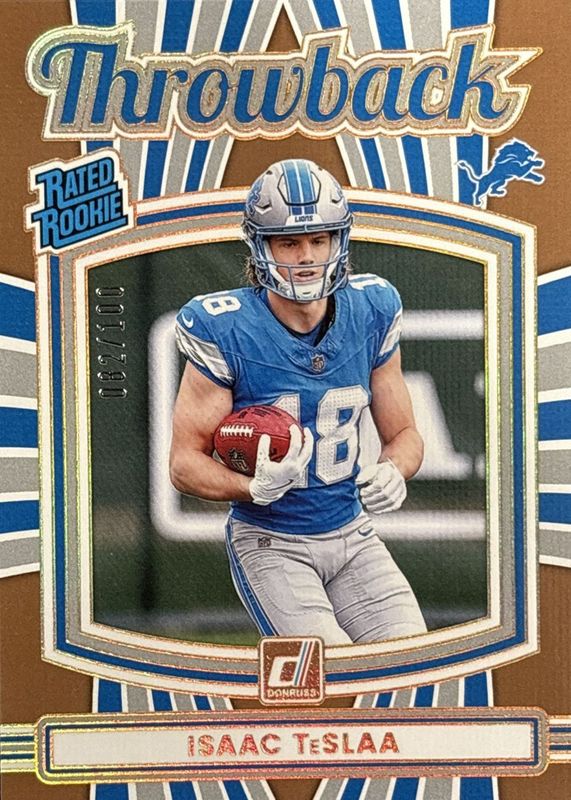 The Isaac TeSlaa 2025 Donruss #22 Rated Rookies Throwback - Studio Series /100 card in Raw condition has moved down -$34.82 (-91.8%) in the last 30 days and was last sold for $3.13 .
