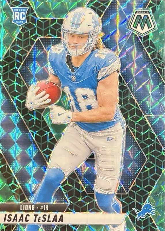 The Isaac TeSlaa 2025 Mosaic #319 FOTL Green Spectris /13 Rookie card in Raw condition has moved down -$5.00 (-2.9%) in the last 30 days and was last sold for $165.00 .