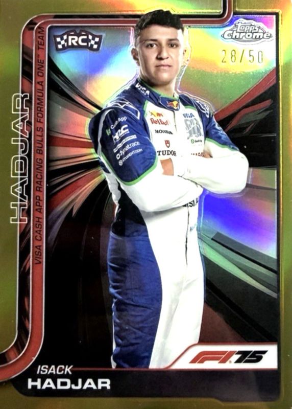 The Isack Hadjar 2025 Topps Chrome Formula 1 #12 Gold Refractor /50 Rookie card in Raw condition has not changed in price in the last 30 days and was last sold for $130.50 .
