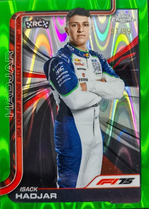 The Isack Hadjar 2025 Topps Chrome Formula 1 #12 Green RayWave Refractor /99 Rookie card in Raw condition has not changed in price in the last 30 days and was last sold for $65.00 .