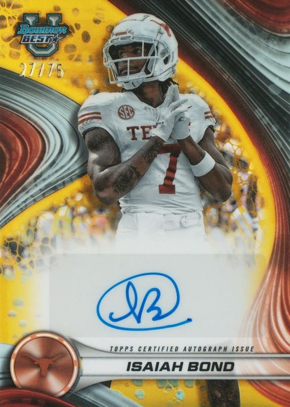 Best Prices Available For Sale of Isaiah Bond 2024 Bowman Best University #BOA-IB Best of 2024 Autographs - Yellow Refractor /75