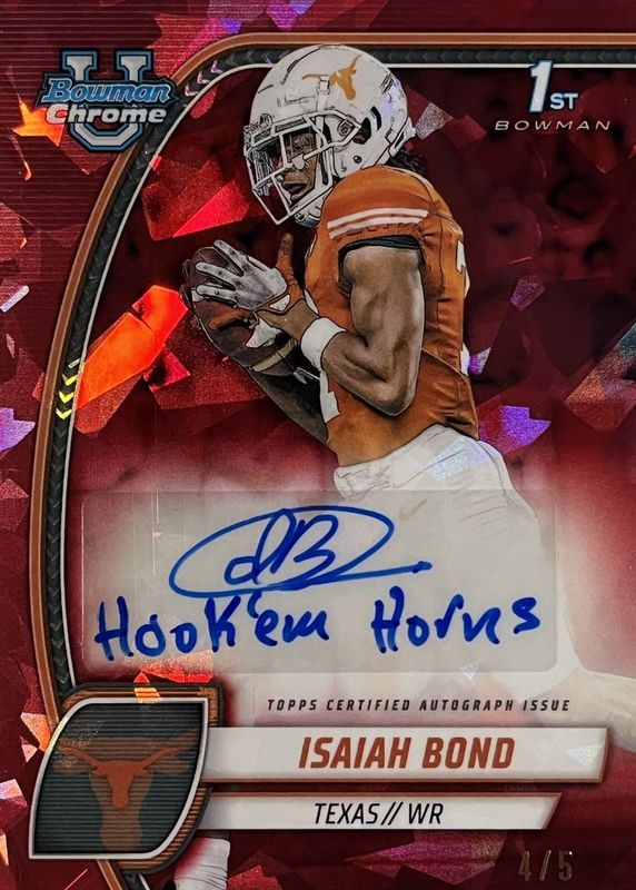 The Isaiah Bond 2024 Bowman Chrome University Sapphire Edition #PA-IBO Prospect Auto - Red /5 (1st) card in Raw condition has not changed in price in the last 30 days and was last sold for $100.00 .