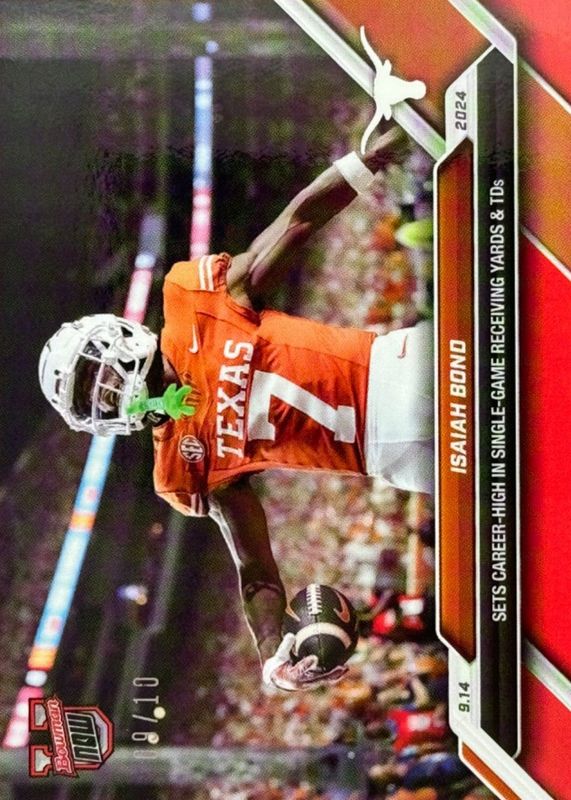 This card is 1 of 6 Isaiah Bond's card variations in the 2024 Bowman U Now set being tracked by Sports Card Investor, including Base (Print Run: 515), Blue /49, Purple /25, Orange /5, and Gold /1.