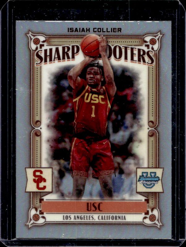 The Isaiah Collier 2023 Bowman Chrome University #SS-7 Sharp Shooters card is 1 of 75 Isaiah Collier's card variations in the 2023 Bowman Chrome University set being tracked by Sports Card Investor, including #96 Base, #96b Base, #96 Pink Refractor, #96 Purple Shimmer Refractor, and #96 Refractor.