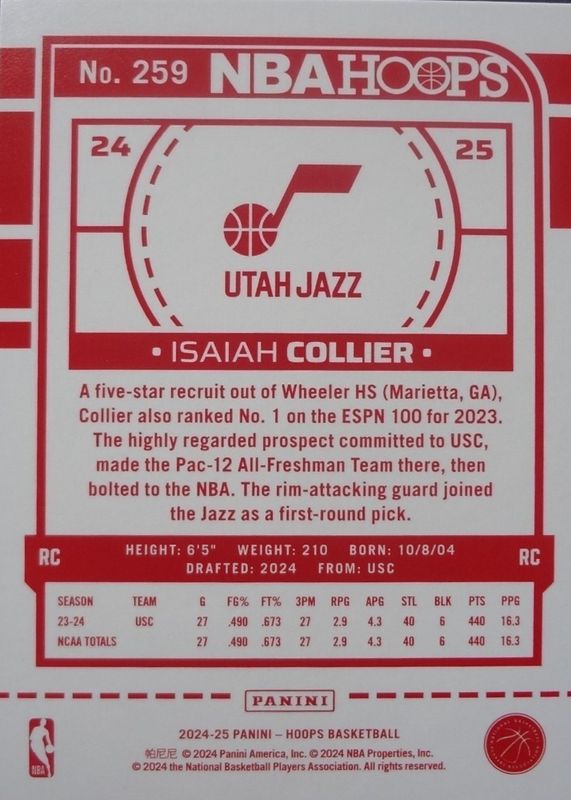 The Isaiah Collier 2024 Hoops #259 Red Backs Rookie card in Raw condition has not changed in price in the last 30 days and was last sold for $7.49 .