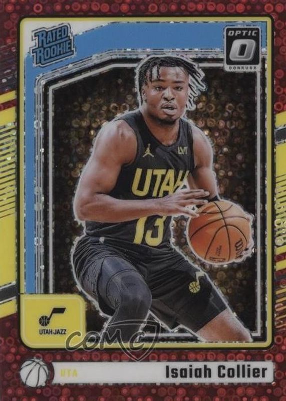 This card is 1 of 77 Isaiah Collier's card variations in the 2024 Optic set being tracked by Sports Card Investor, including Base, Blue Velocity, Checkerboard, Choice, and Fast Break.