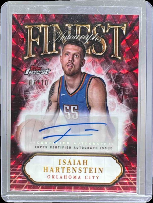 The Isaiah Hartenstein 2024 Topps Finest #FA-IH Finest Autographs - Red Black Geometric Refractor /10 card is 1 of 15 Isaiah Hartenstein's card variations in the 2024 Topps Finest set being tracked by Sports Card Investor, including Finest Autographs, Finest Autographs - Geometric Refractor, Finest Autographs - Refractor, Finest Autographs - Blue Geometric Refractor /99, and Finest Autographs - Blue X-Fractor /99.