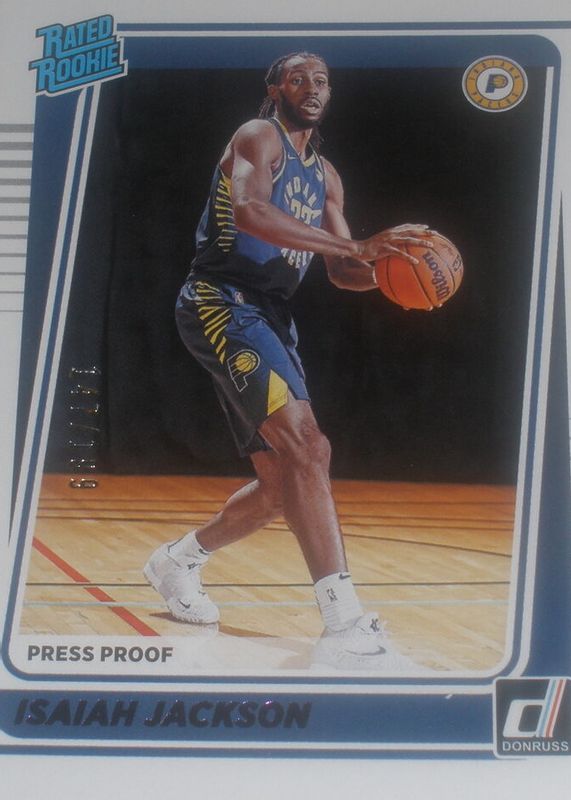 The Isaiah Jackson 2021 Donruss #217 Press Proof Purple /199 Rookie card in Raw condition has not changed in price in the last 30 days and was last sold for $2.25 .