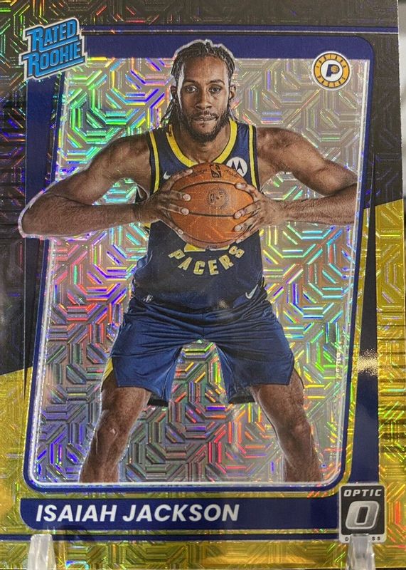 The Isaiah Jackson 2021 Optic #167 Choice Black & Gold /8 Rookie card in Raw condition has not changed in price in the last 30 days and was last sold for $50.00 .