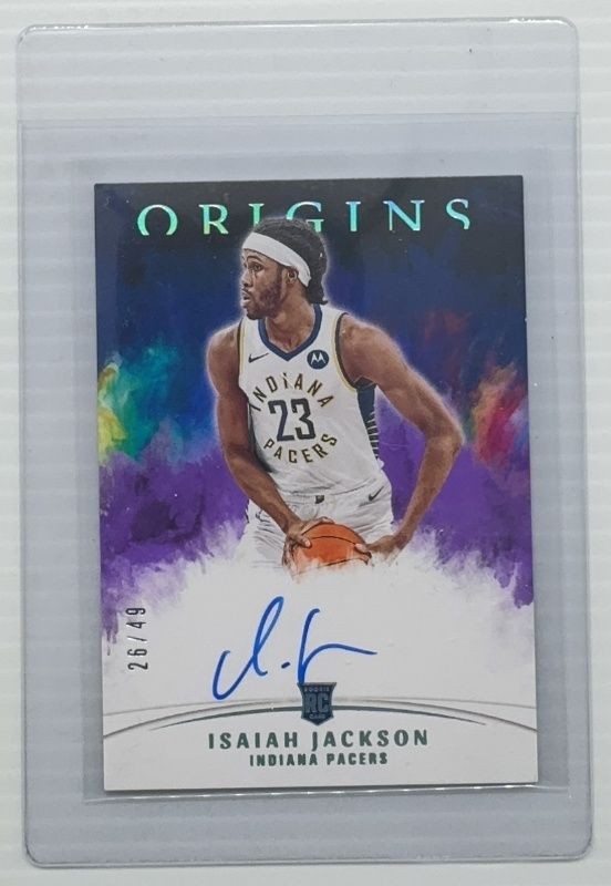 The Isaiah Jackson 2021 Origins #RA-ISA Rookie Autographs - Purple FOTL /49 card is 1 of 39 Isaiah Jackson's card variations in the 2021 Origins set being tracked by Sports Card Investor, including Base, Red, Blue /99, Orange /75, and Pink /60.